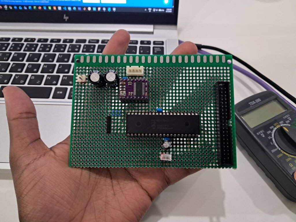 [Vol.2]JICAインターン生とのモーターコントロールプロジェクト 2026年4月10日 最終更新日時 : 2026年4月10日 megatrade 成功!PICマイコンの書き込みとデバッグが終わりました。ちゃんと動いたし、煙も出ませんでした! 実装の様子